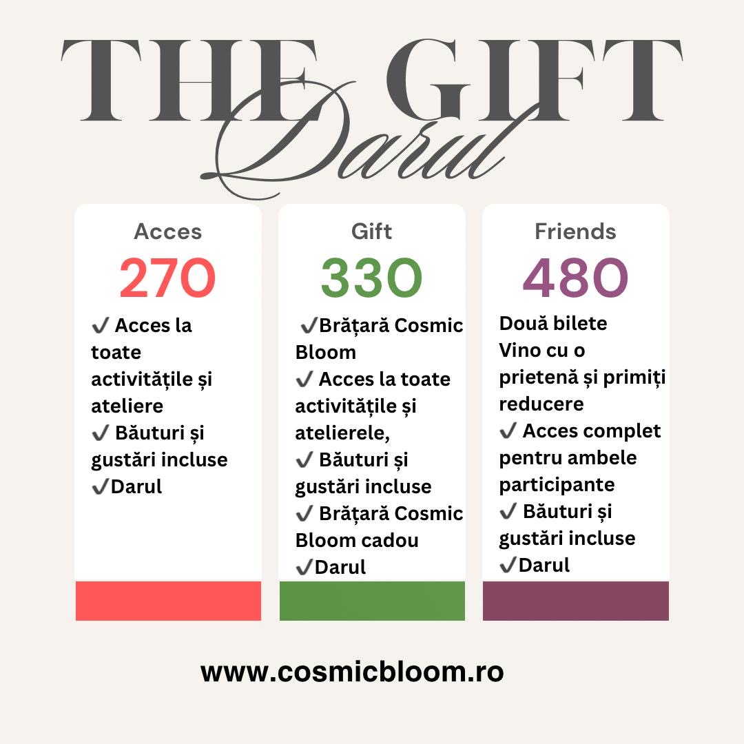 Și, așa cum te-am obișnuit la fiecare ediție Cosmic Bloom, vei pleca acasă cu un DAR fizic– un obiect creat special pentru tine, care să îți amintească în fiecare zi de darul tău interior și de forța pe care ai trezit-o aici.